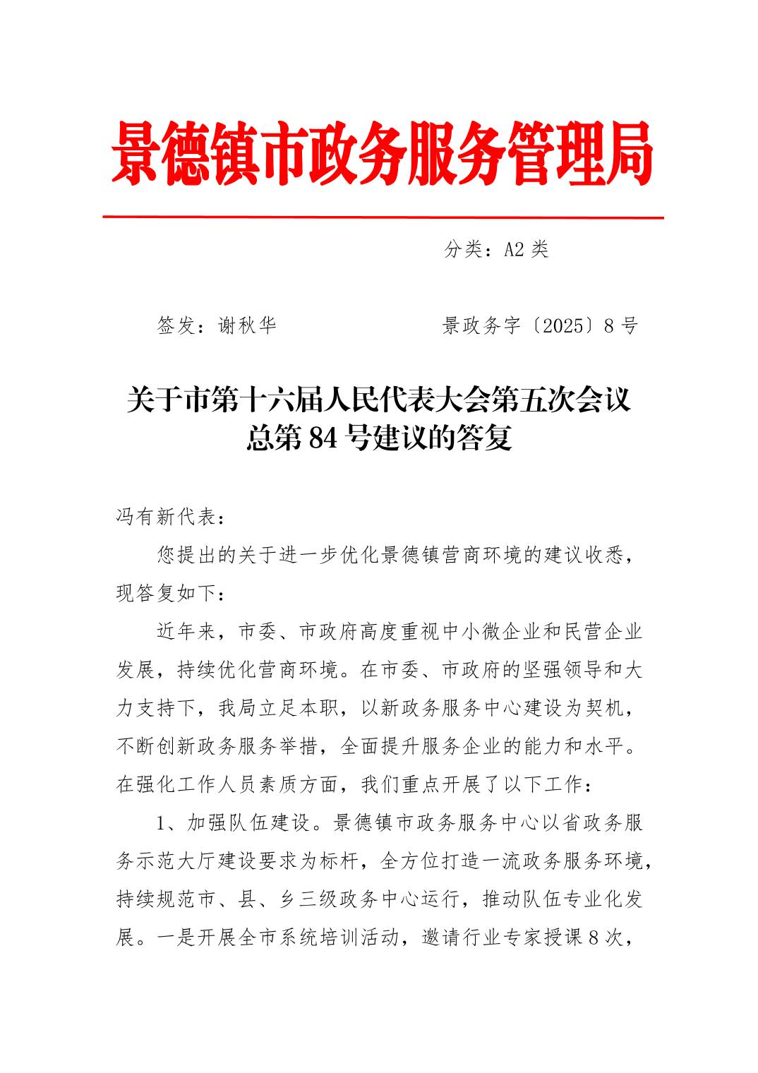 关于市第十六届人民代表大会第五次会议总第84号建议的答复