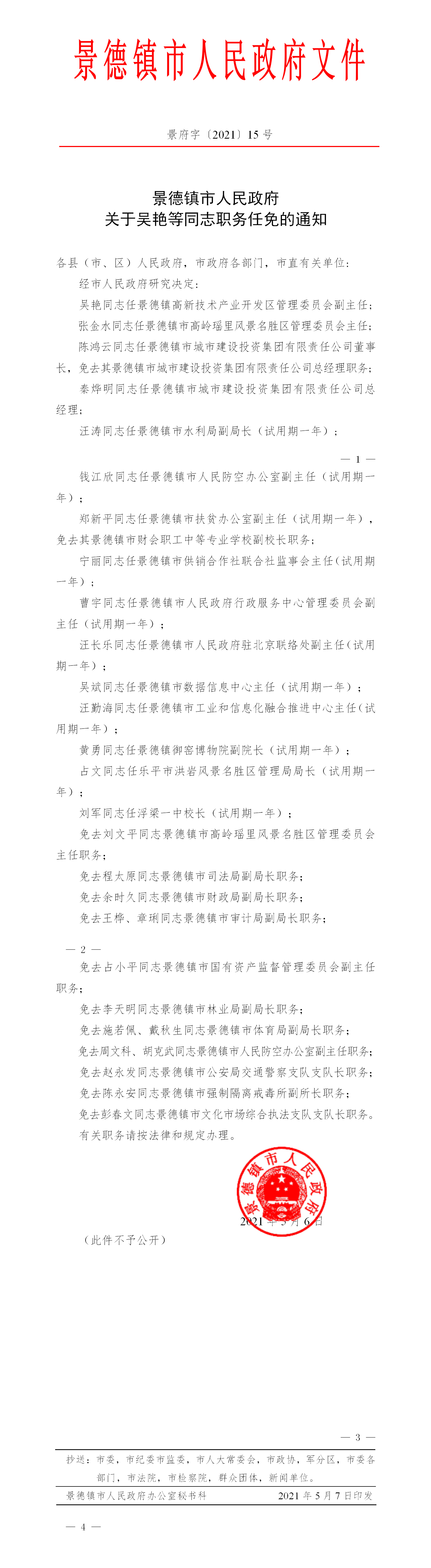 景德镇市人民政府关于吴艳等同志职务任免的通知
