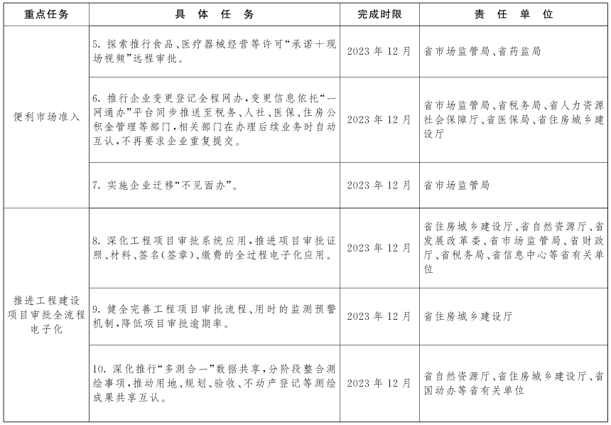二、推进工程建设项目审批全流程电子化。深化工程项目审批系统应用,推进项目审批证照、材料、签名(签章)、缴费的全过程电子化应用。健全完善工程项目审批流程、用时的监测预警机制,降低项目审批逾期率。深化推行“多测合一”数据共享,分阶段整合测绘事项,推动用地、规划、验收、不动产登记等测绘成果共享互认。(责任单位:省住房城乡建设厅、省自然资源厅、省发展改革委、省市场监管局、省国动办等省有关单位)