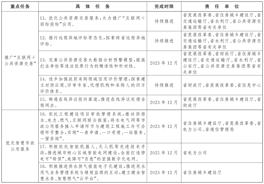 四、优化智慧市政公用服务。依托工程建设项目审批管理系统,推动水电气网联合报装,实现“一表申请、一口受理、一站服务、一窗咨询”。积极依托智能机器人、无人机等先进技术手段,推进城市核心区域智能电网建设,全面打造停电可“转供”、故障可“自愈”的坚强数字化电网。积极推进供水供气报装电子化建设,推进用水用气业务管理系统与绩效监测的互动,建立健全智慧水务、智慧燃气“云平台”。(责任单位:省住房城乡建设厅、省发展改革委、省电力公司、省通信管理局)