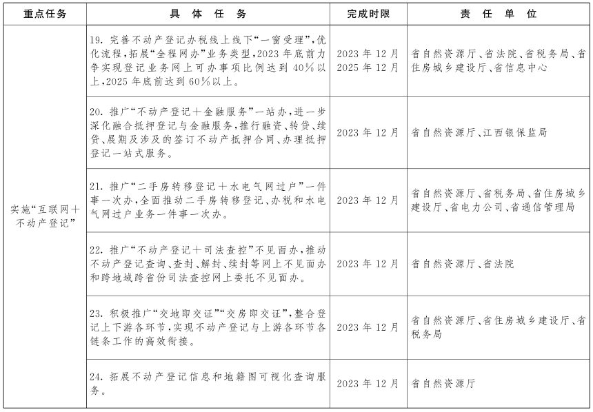 五、实施“互联网+不动产登记”。完善不动产登记办税线上线下“一窗受理”,优化流程,拓展“全程网办”业务类型。推广“不动产登记+金融服务”一站办、“二手房转移登记+水电气网过户”一件事一次办、“不动产登记+司法查控”不见面办。积极推广“交地即交证”“交房即交证”。拓展不动产登记信息和地籍图可视化查询服务。(责任单位:省自然资源厅、省住房城乡建设厅、省税务局、江西银保监局、省法院、省电力公司、省通信管理局、省信息中心)