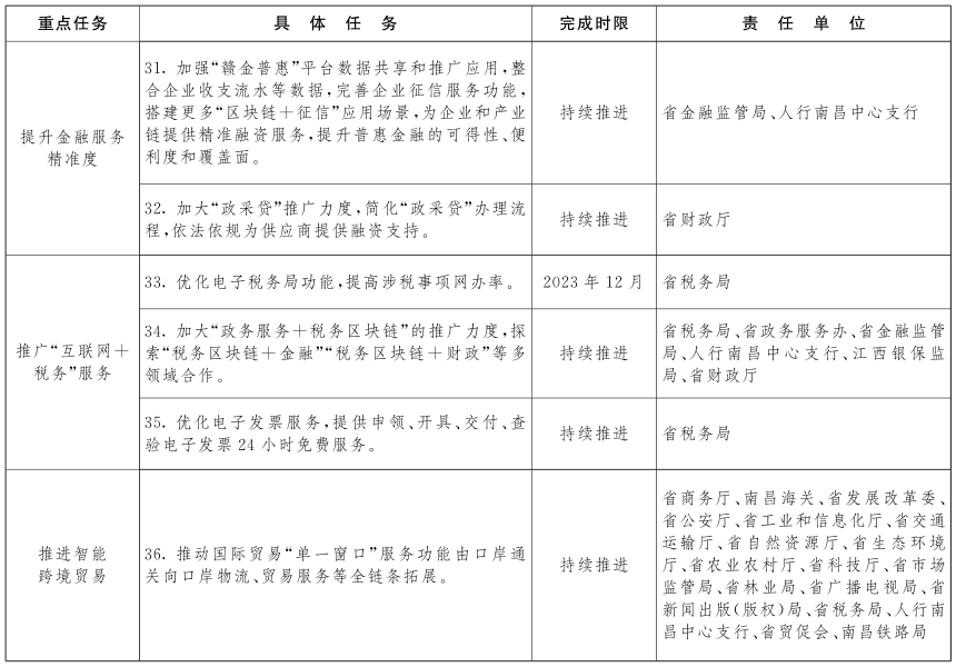 八、推广“互联网+税务”服务。优化电子税务局功能,提高涉税事项网办率。加大“政务服务+税务区块链”推广力度,探索“税务区块链+金融”“税务区块链+财政”等多领域合作。优化电子发票服务,提供申领、开具、交付、查验电子发票24小时免费服务。(责任单位:省税务局、省政务服务办、省金融监管局、人行南昌中心支行、江西银保监局、省财政厅)