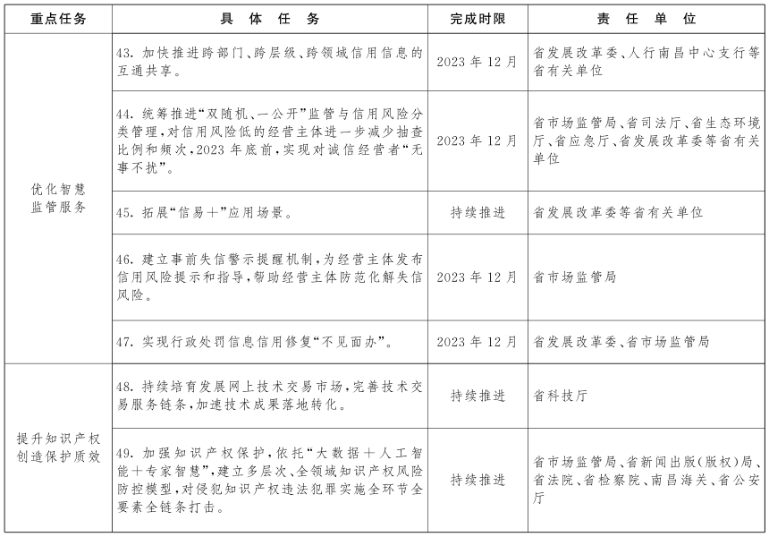 十一、提升知识产权创造保护质效。持续培育发展网上技术交易市场,完善技术交易服务链条,加速技术成果落地转化。加强知识产权保护,依托“大数据+人工智能+专家智慧”,建立多层次、全领域知识产权风险防控模型,对侵犯知识产权违法犯罪实施全环节全要素全链条打击。(责任单位:省市场监管局、省科技厅、省新闻出版〔版权〕局、省法院、省检察院、南昌海关、省公安厅)