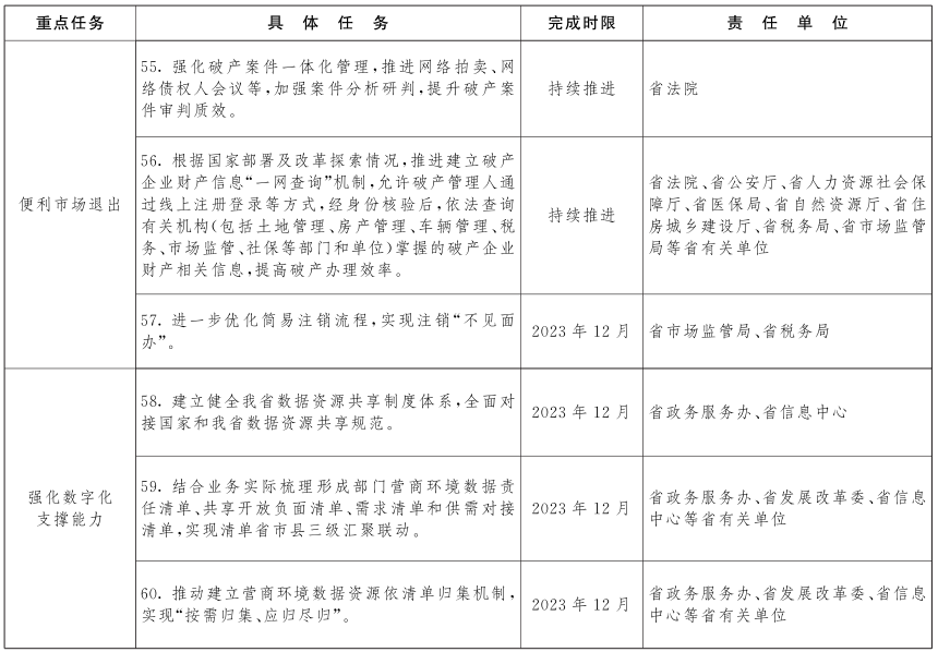十四、便利市场退出。强化破产案件一体化管理,推进网络拍卖、网络债权人会议等,加强案件分析研判,提升破产案件审判质效。探索建立破产企业财产信息“一网查询”机制,便利破产管理人线上查询。进一步优化简易注销流程,实现注销“不见面办”。(责任单位:省法院、省自然资源厅、省住房城乡建设厅、省公安厅、省税务局、省市场监管局、省人力资源社会保障厅、省医保局等省有关单位)