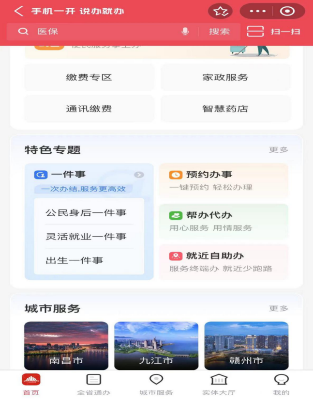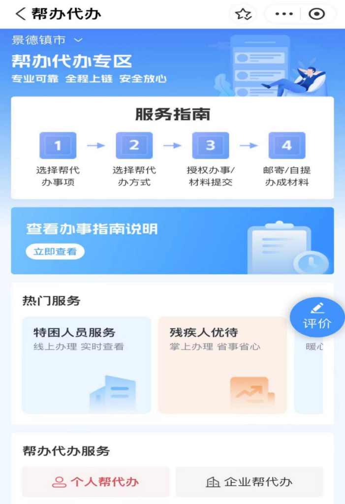 支付宝搜索“赣服通”,进入后选择“景德镇市”,找到特色专题后选择“帮办代办”