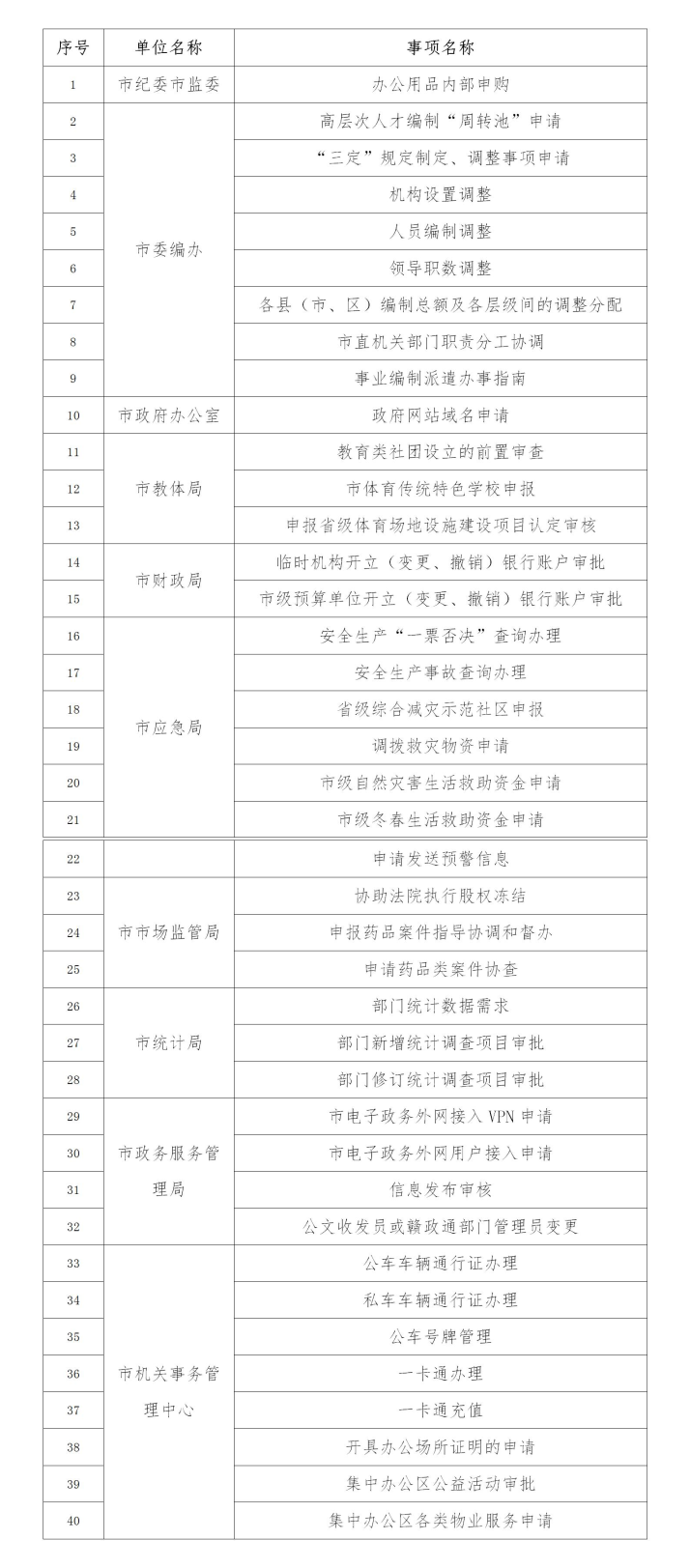为推动机关内部办事流程再造和效能提升,建设高效协同内跑体系,实现“材料申请一份表,办事平台一张网,部门联办一件事”,景德镇市政务服务管理局前期已调研、梳理市级内跑事项清单,并在“赣政通”平台建设机关内部事务专区,上线40项机关内部“最多跑一次”事项,可实现掌上办理,现予以发布。