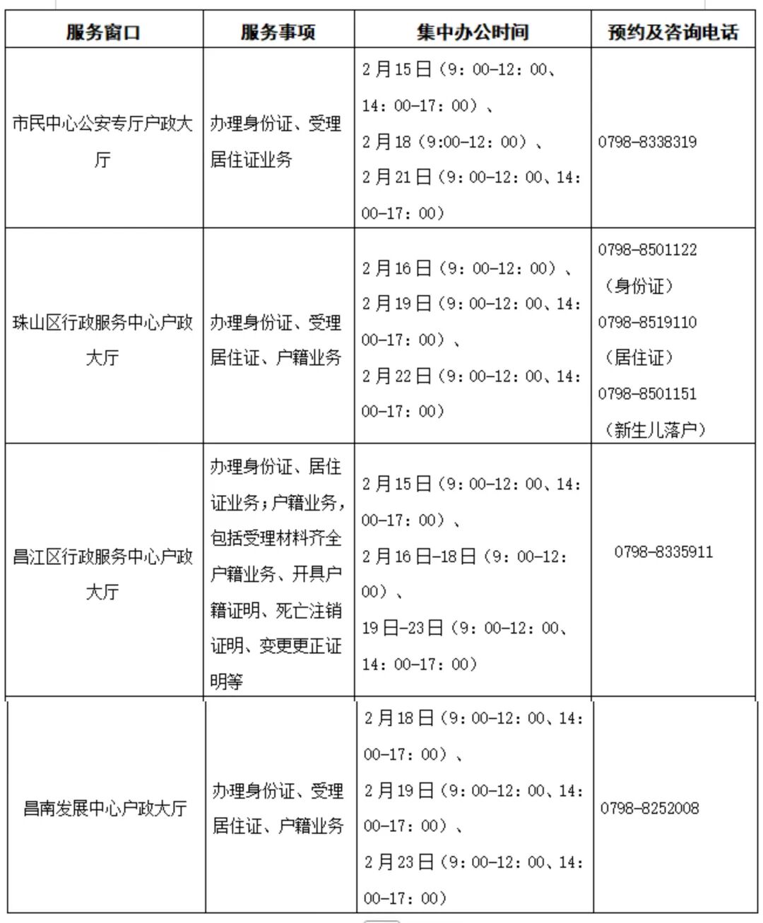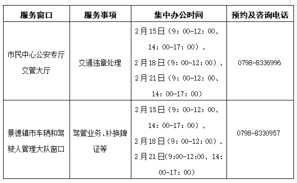 2026年春节将至,为方便外出务工、经商、求学返乡群众办证办事,确保错时延时服务不间断,景德镇市城区公安户政、出入境、交管窗口于春节期间积极开展错时延时办公,非延时期间提供预约服务(请工作时间电话预约)。具体如下: