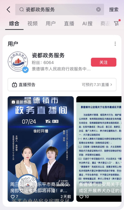 1、抖音搜索“瓷都政务服务”,点击关注,进入政务账号。