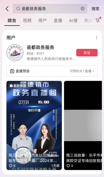 1、抖音搜索“瓷都政务服务”,点击关注,进入政务账号。
