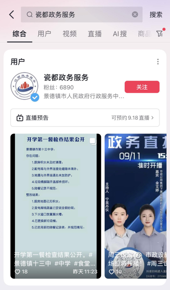 1、抖音搜索“瓷都政务服务”,点击关注,进入政务账号。