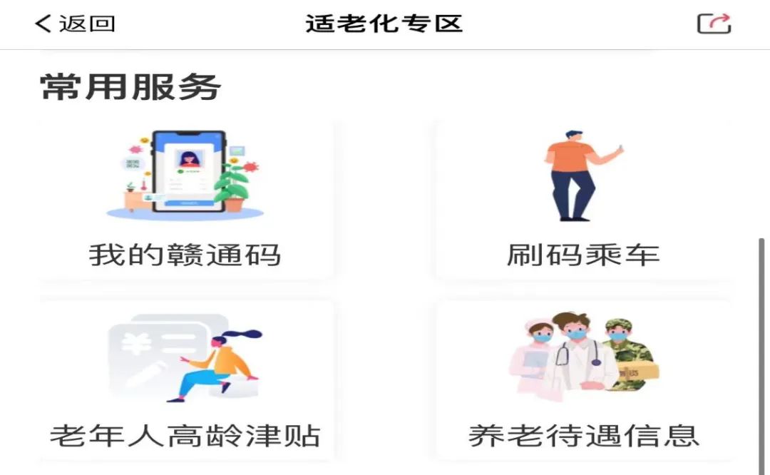 为方便老年人快速找到所需要的服务事项,专区提供我的赣通码、刷码乘车、老年人高龄津贴、养老待遇信息四个常用专区查找服务,更多区域正在建设中。