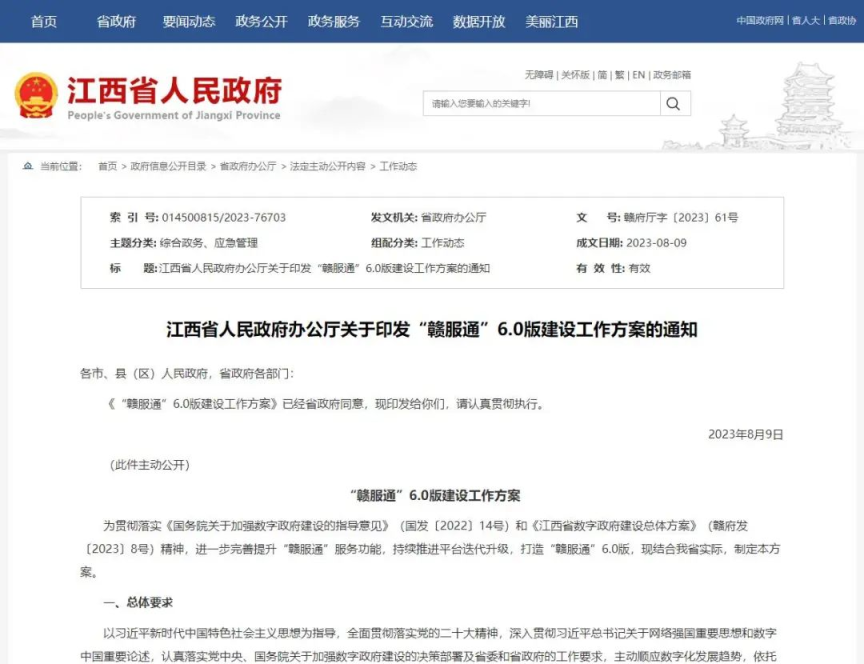为进一步完善提升“赣服通”服务功能,持续推进平台迭代升级,打造“赣服通”6.0版,近日,江西省人民政府办公厅印发了《“赣服通”6.0版建设工作方案》(以下简称《工作方案》)。