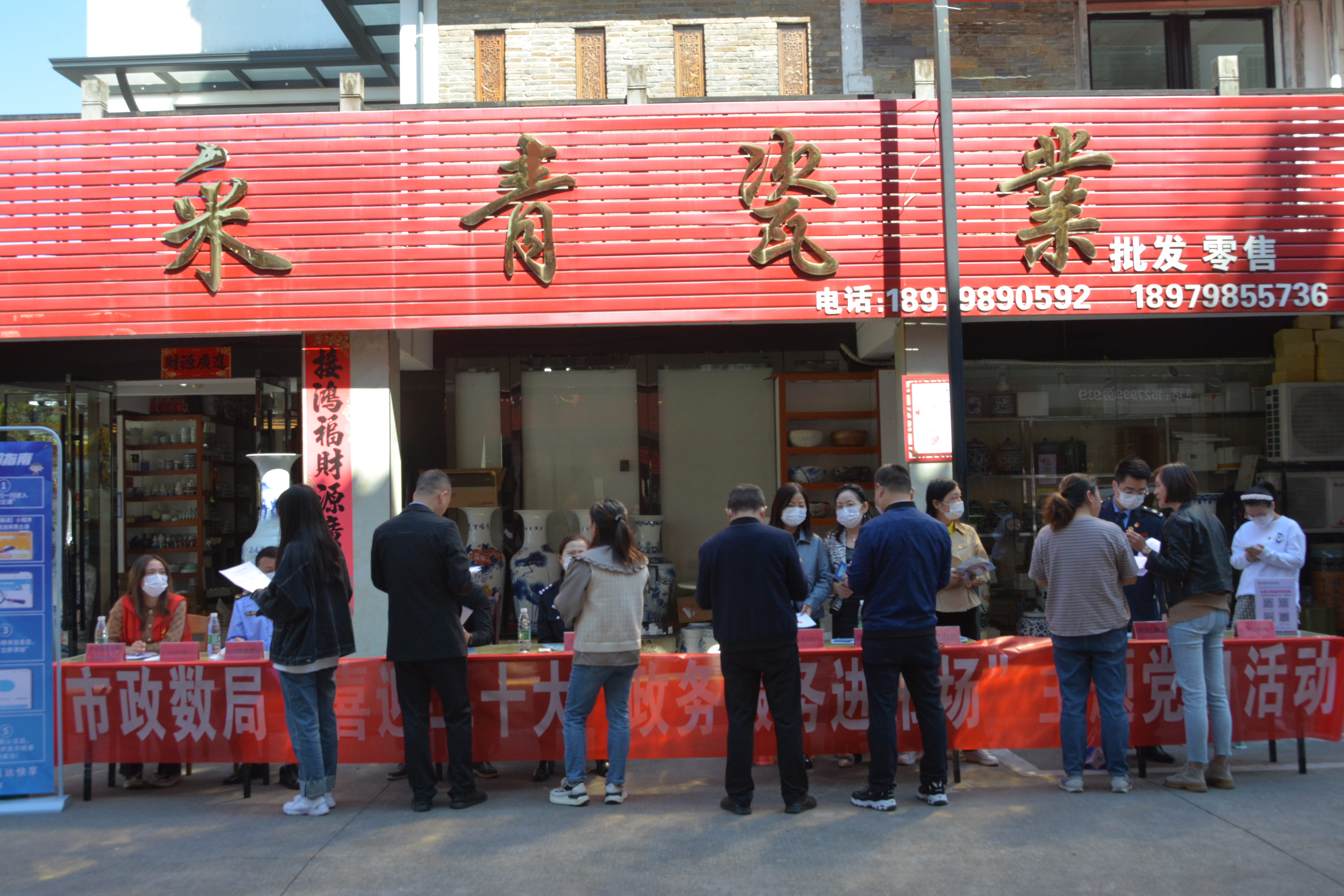 为党的二十大胜利召开,打造“景快办”政务服务品牌,10月19日上午,市政数局组织开展“喜迎二十大 政务服务进社区进市场”主题党日活动。